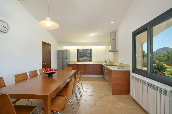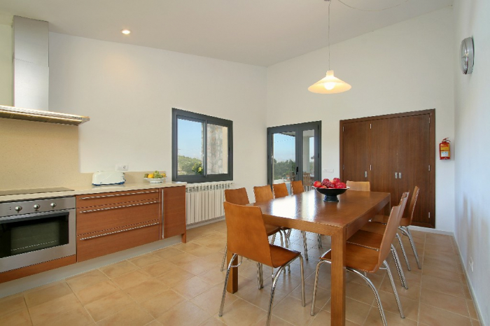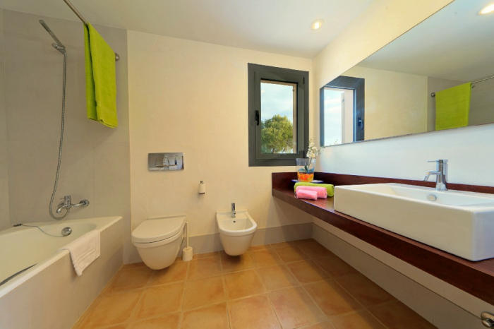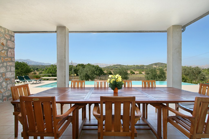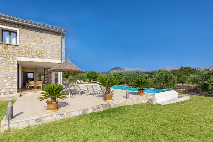 Outside, the villa is equally impressive. Steps lead from the dining room terrace to the lawn area. Right next door is the built-in barbecue. The large private pool is surrounded by lawned gardens and vaulted terraces for sunbathing, perfect for enjoying long hours under the Mallorcan sun. Sun loungers and umbrellas are provided for guests to enjoy.