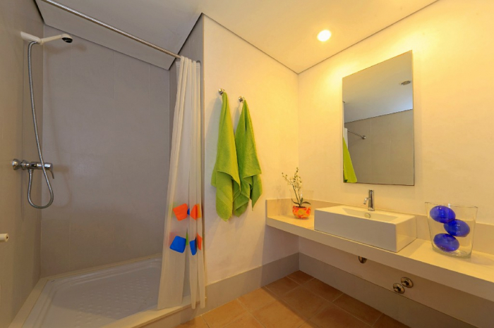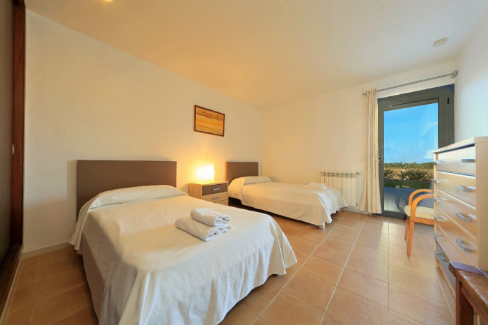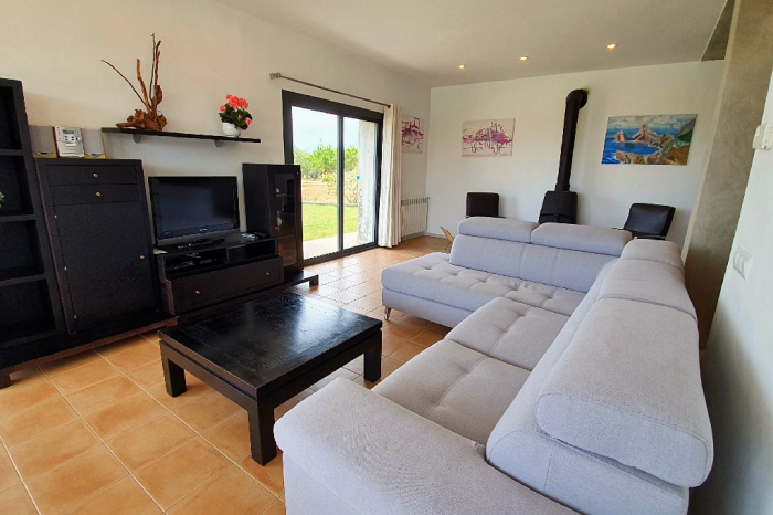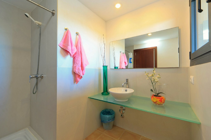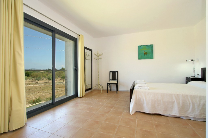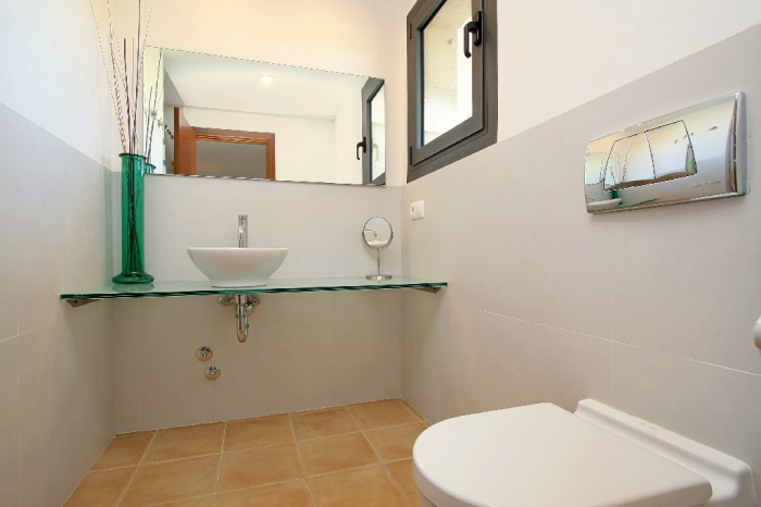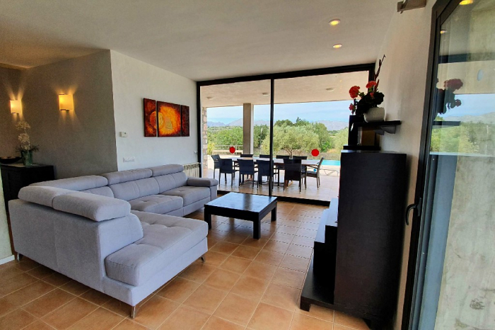 The ground floor consists of a huge and spacious living/dining room with comfortable sofas, modern furniture and a large dining table with ten chairs. From here, two glass doors not only give access to the garden and the covered terrace, but also offer stunning views of the surroundings and the pool. Leaving the dining room, there is a long corridor that leads to the bedrooms and bathrooms. 3 of the bedrooms are located on the ground floor: there is a double bedroom with a full en-suite bathroom, a twin bedroom with a private bathroom with a shower, another bedroom with two single beds and a bathroom with a shower. All of these rooms have doors leading to a covered terrace with beautiful views of the countryside. The stairs lead to the first floor, which houses a twin bedroom, a double bedroom (with a floor-to-ceiling window with incredible views of Pollensa Bay and beyond) and a full bathroom. The interiors have been modernly furnished and stylishly designed to provide a contemporary feel and are filled with natural light.