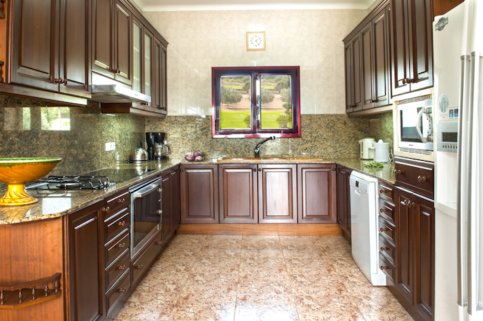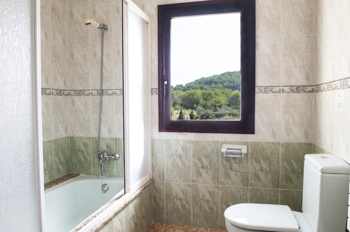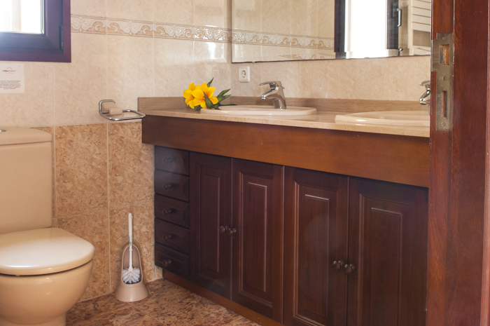 Lounge/dining room with sofas and oak dining table. Patio doors lead out onto a covered terrace, which in turn overlooks the pool, terraces and open countryside beyond. Leading from the more formal dining area there is a further, more simply furnished diningroom with large table and seating for 10. The well fitted oak kitchen is located next. There is a laundry with washing machine for your added convenience. Cloakroom with WC. On the ground floor level also are twin bedded room and the master double with patio doors onto its own front terrace. The bathroom en-suite to this master bedroom has Jacuzzi corner bath, walk-in shower. This en-suite bathroom is used for the two bedrooms of the ground floor.