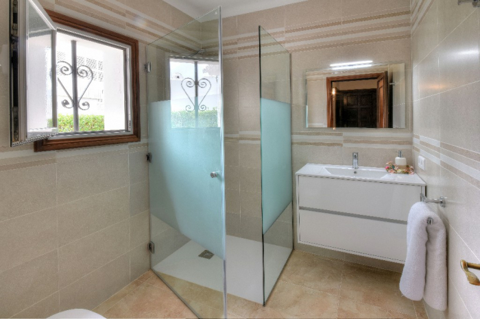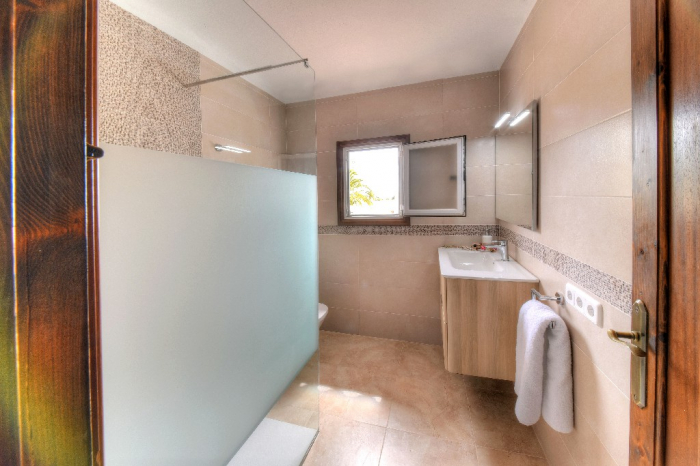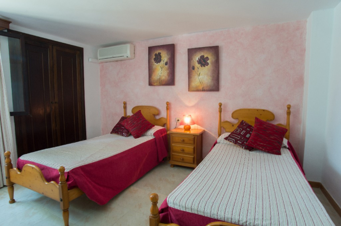 Dos Pinos is a large holiday home, perfect for a big group of friends or a large family. The house has two living rooms. From the main door we enter directly to a bright living room, and from here there is access to a second living/dining room with a side door that opens to the outside. The fitted kitchen is adjacent to the dining/living room and has a side door to the pool area. The ground floor also offers three bedrooms. Two twin bedrooms and a double bedroom that share two separate shower-room. From then entrance a stair leads to the upper floor where we find two more bedrooms a double and a twin bedroom -each with its own en suite shower room-.