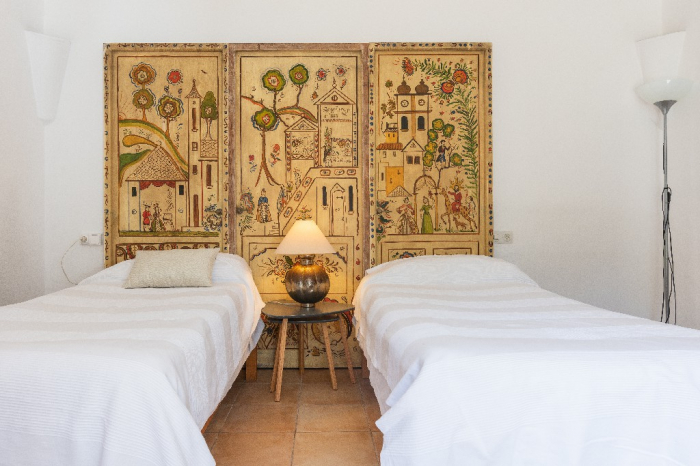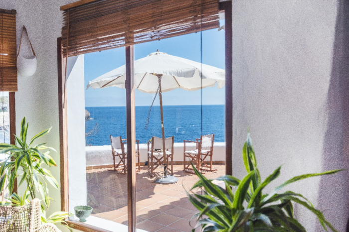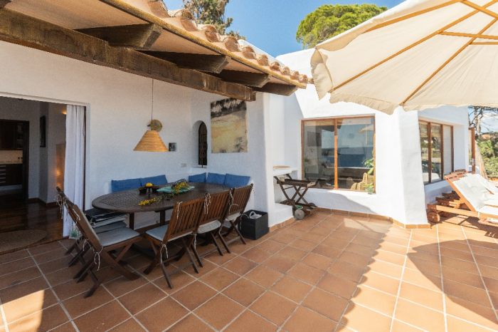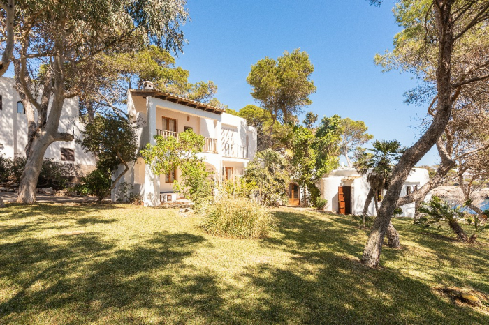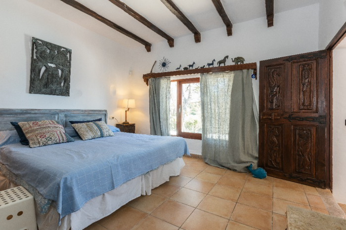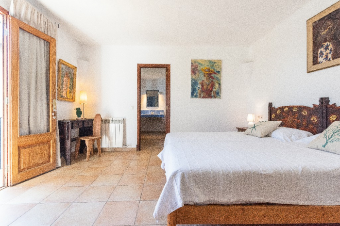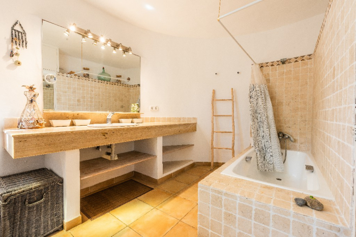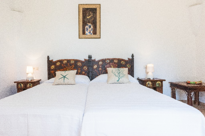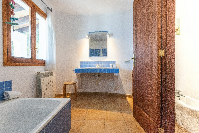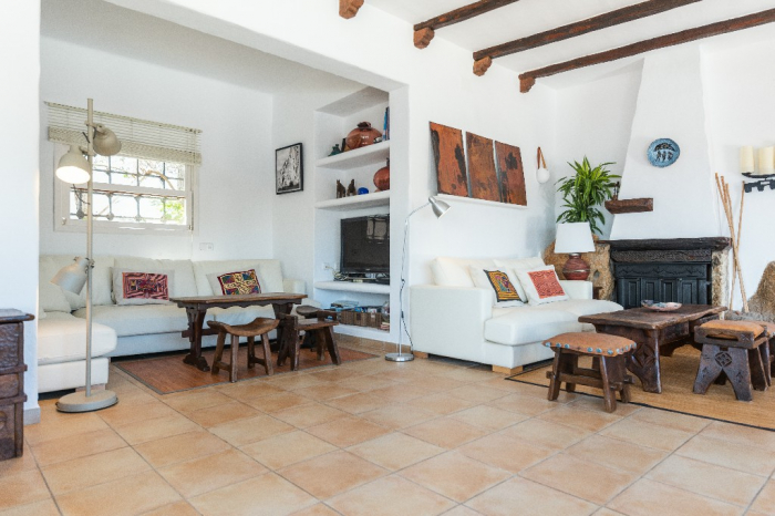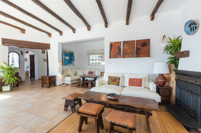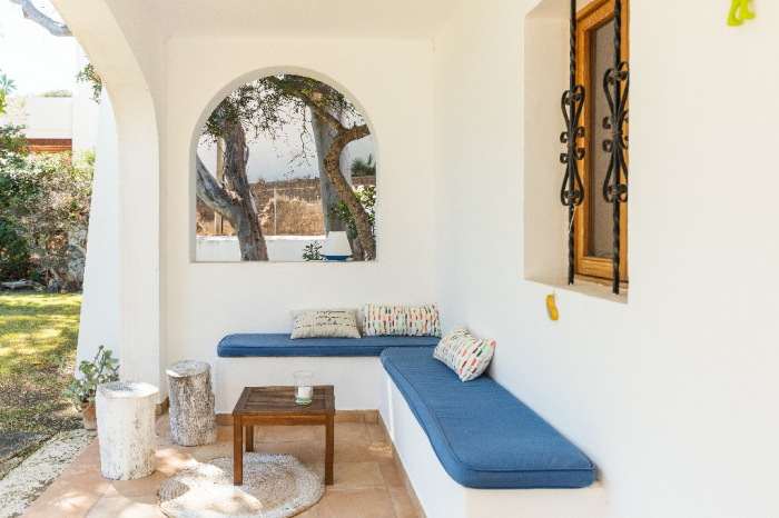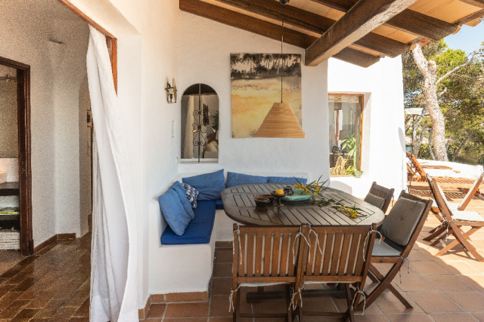 The living area of Villa Lorenzo is full of natural light and all the house with traditional white ibiza style design and hand-made furniture. The friendly rooms have white walls, terracota-tiled floors and beamed ceilings. Steps lead down from the front door to a lounge and dining room with two seating areas. From large windows and doors which lead to the terrace you enjoy fantastic sea views. The well planed fitted kitchen with all modern appliances doors lead out from here to the terrace, with a covered dining area. On the ground floor there is one bedroom with a double bed and another with two single beds. Both rooms have a complete bathroom en-suite. The first floor accomodates one more double room with two single beds and a shower bathroom. The remaining bedroom is in a separate tower annexe and you reach it with staircase on the outside. It is a lovely double room with two single beds, a shower-bathroom and a long private sun-terrace with superb views of the entrance to the cove. A very light and airy house thanks to its orientation and distribution. Every room in the house have windows and / or connection to the garden.