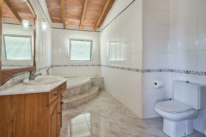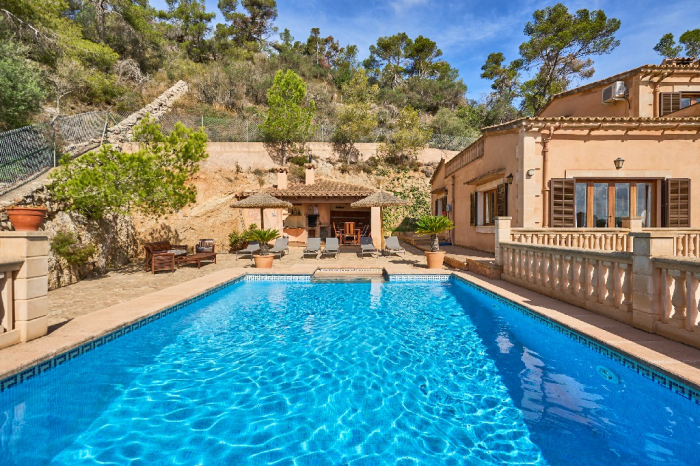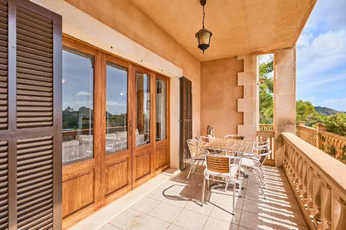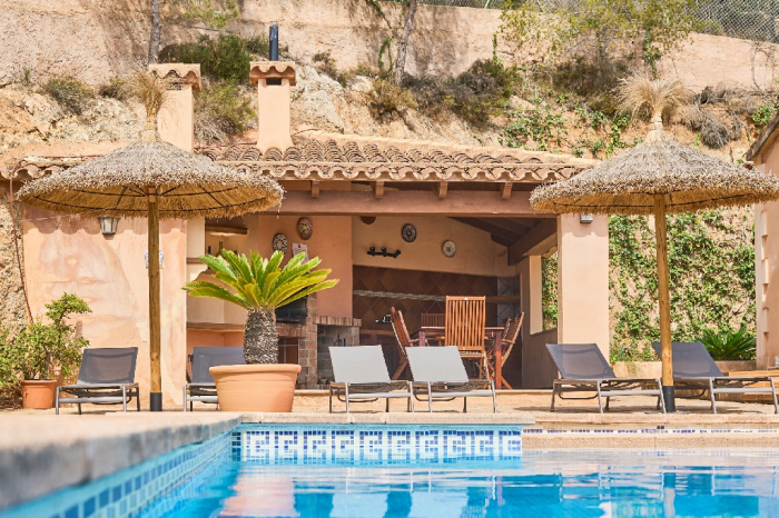 Cozy outdoor area with a porch next to the pool, a built-in barbecue and a table to enjoy al fresco meals with spectacular open views. There is also an area with a table and chairs to relax and enjoy the views of the beautiful Mallorcan countryside both day and night.