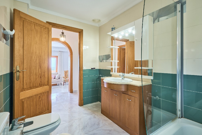 As we go to the upper floor, we find an office next to the landing. On this floor there are two bedrooms with double bed -one with access to its own terrace-, and a bathroom. From the hallway there is access to a terrace where you can sit and enjoy the open views of the area.