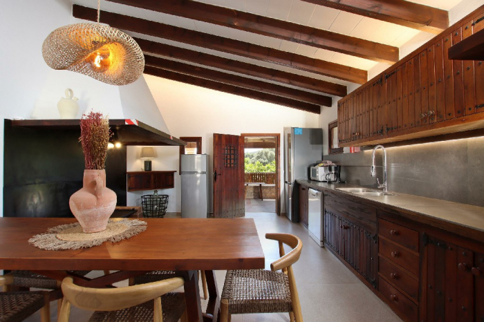 En la planta baja encontramos un amplio salón con una pared revestida de piedra y vigas originales, amueblado con varios sofás, sillas y una Smart TV. La amplia cocina tradicional, equipada con electrodomésticos modernos y una mesa de comedor, ofrece un amplio espacio para comidas familiares.
