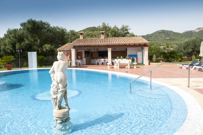 Outside there is a superb covered terrace and a few steps lead down to a most superb 15 metre pool with feature statue (partly submerged) and with an extensive splash area for children to play and enjoy. Spacious terraces surround the pool and a major feature here is the barbeque kitchen with seating for those meals al-fresco.