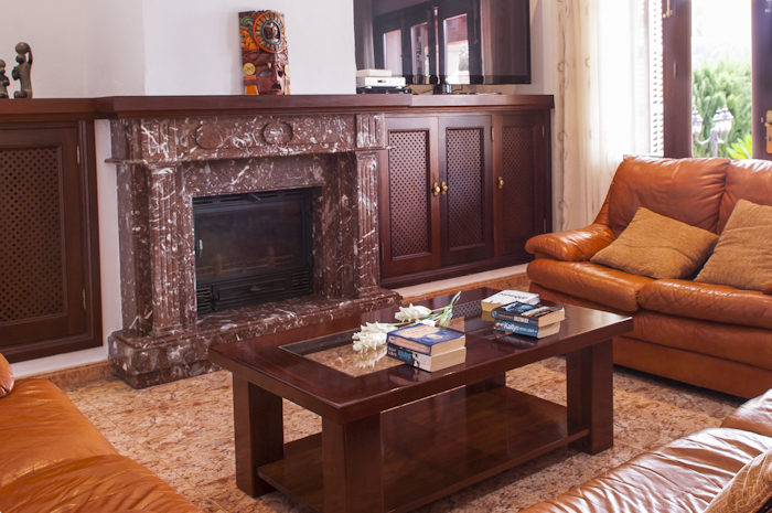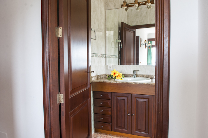 Lounge/dining room with sofas and oak dining table. Patio doors lead out onto a covered terrace, which in turn overlooks the pool, terraces and open countryside beyond. Leading from the more formal dining area there is a further, more simply furnished diningroom with large table and seating for 10. The well fitted oak kitchen is located next. There is a laundry with washing machine for your added convenience. Cloakroom with WC. On the ground floor level also are twin bedded room and the master double with patio doors onto its own front terrace. The bathroom en-suite to this master bedroom has Jacuzzi corner bath, walk-in shower. This en-suite bathroom is used for the two bedrooms of the ground floor.