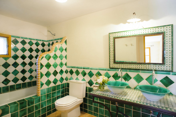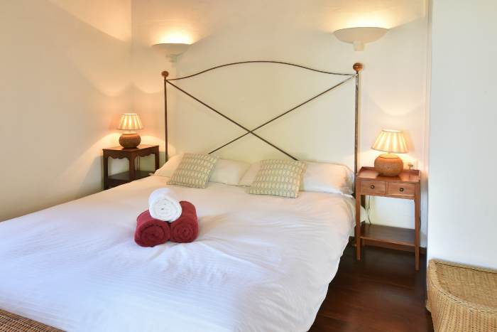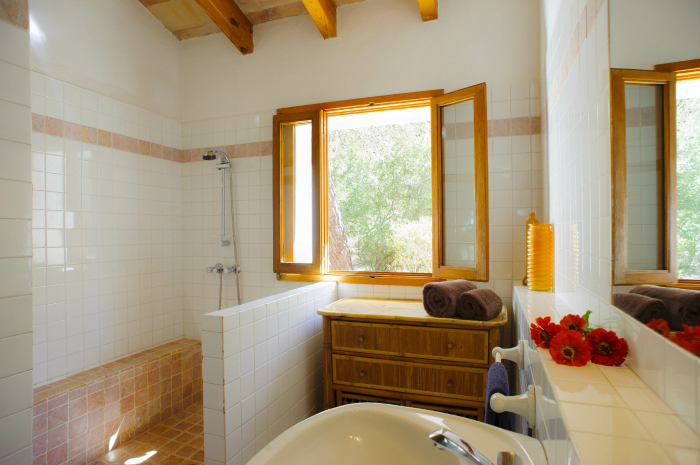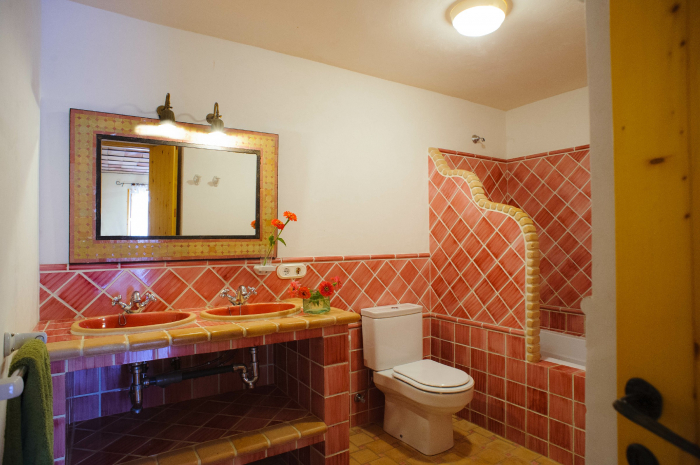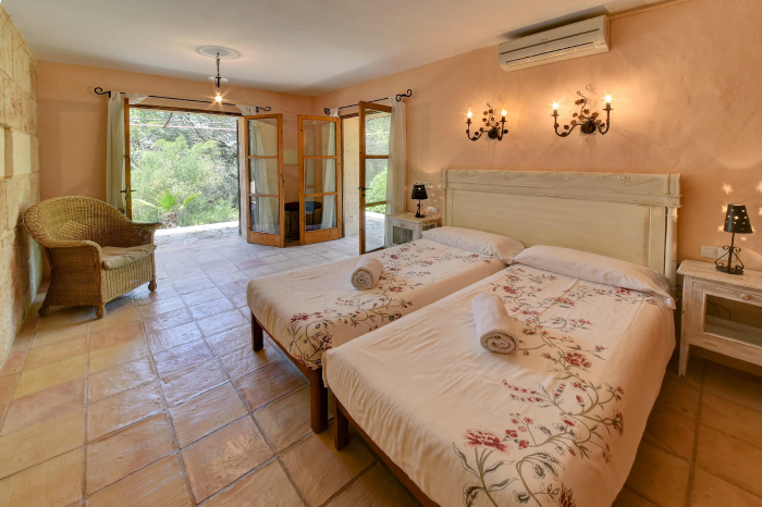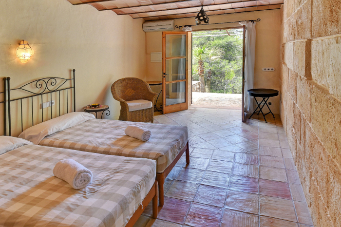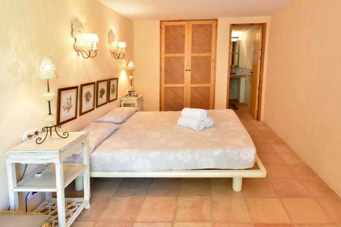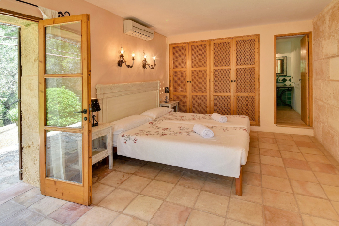 The other three bedrooms are separated from the house and have external access. They are in a lower level. A few steps down from the terrace lead to this area. There is a double bedroom with en suite shower room and two twin bedrooms, each with en suite bathroom. All the ground floor of the main building offers underground heating. The bedroom located on the first floor of the main house and also the external bedrooms count air conditioning cold/warm.