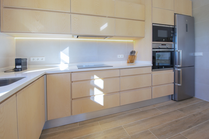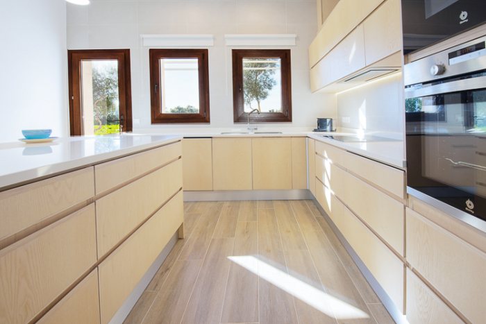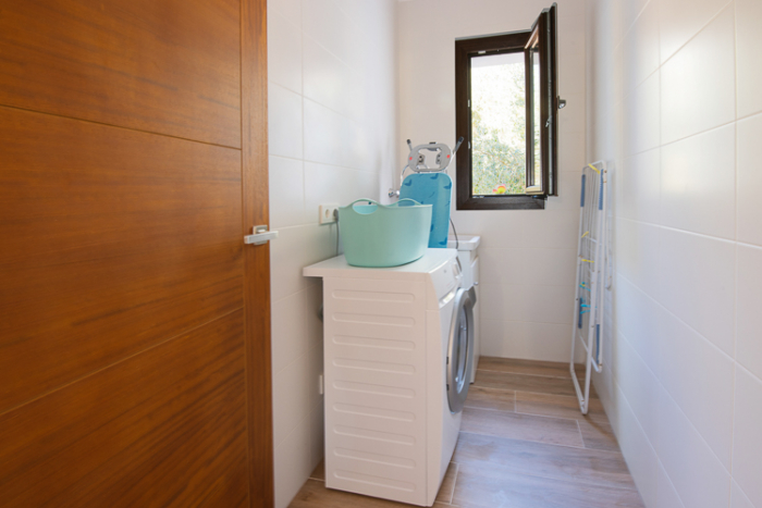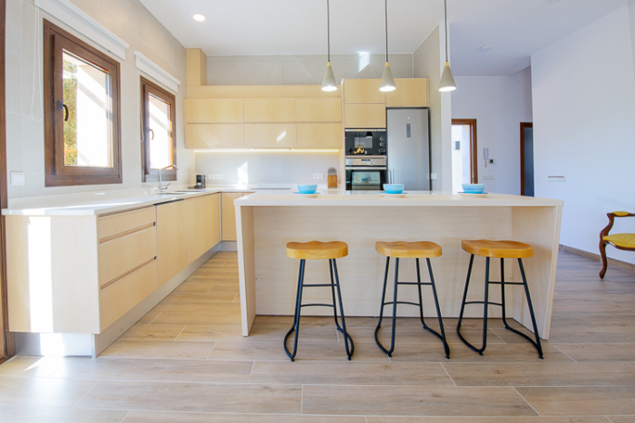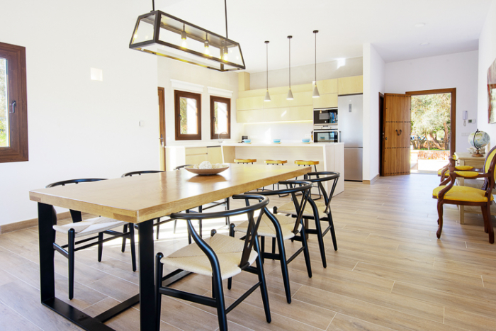 Luminous L-shaped designed country house, therefore all the rooms have access to the outside and enjoy many hours of sunlight. From the entrance there is direct access to an open area with an island kitchen, dining table and living area, all with access to the terrace. Close to the kitchen is the laundry room.