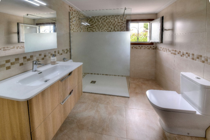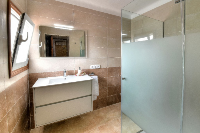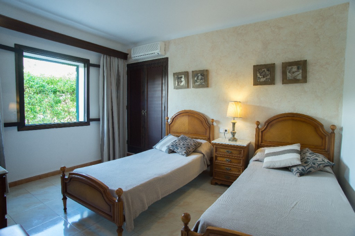 Dos Pinos is a large holiday home, perfect for a big group of friends or a large family. The house has two living rooms. From the main door we enter directly to a bright living room, and from here there is access to a second living/dining room with a side door that opens to the outside. The fitted kitchen is adjacent to the dining/living room and has a side door to the pool area. The ground floor also offers three bedrooms. Two twin bedrooms and a double bedroom that share two separate shower-room. From then entrance a stair leads to the upper floor where we find two more bedrooms a double and a twin bedroom -each with its own en suite shower room-.