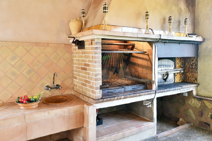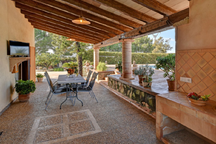 Covered barbecue area, with dining table, SAT-TV and shower room with the washing machine.
