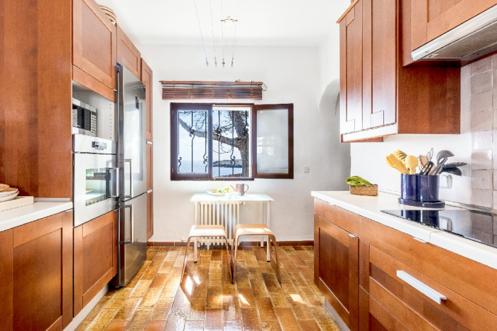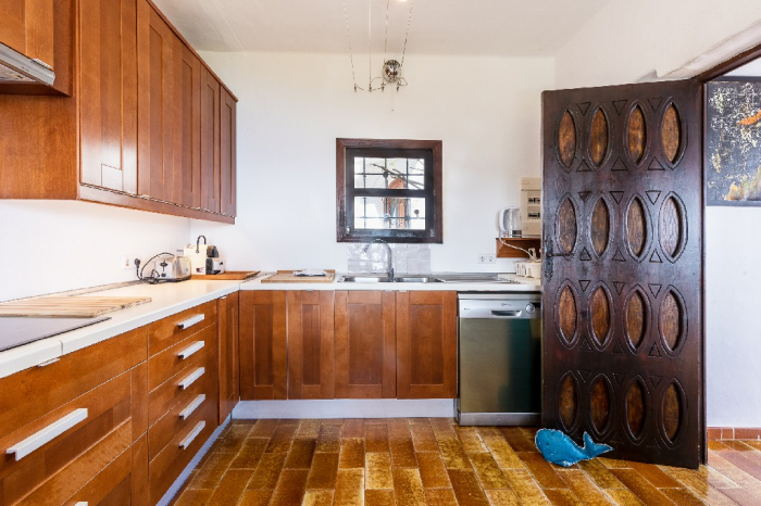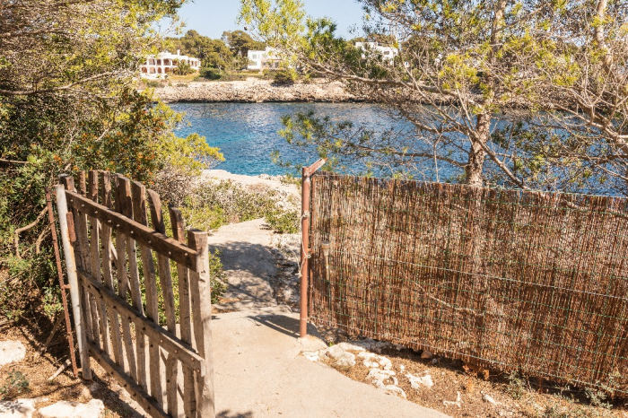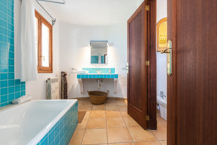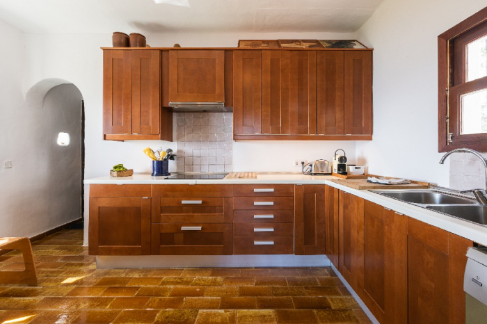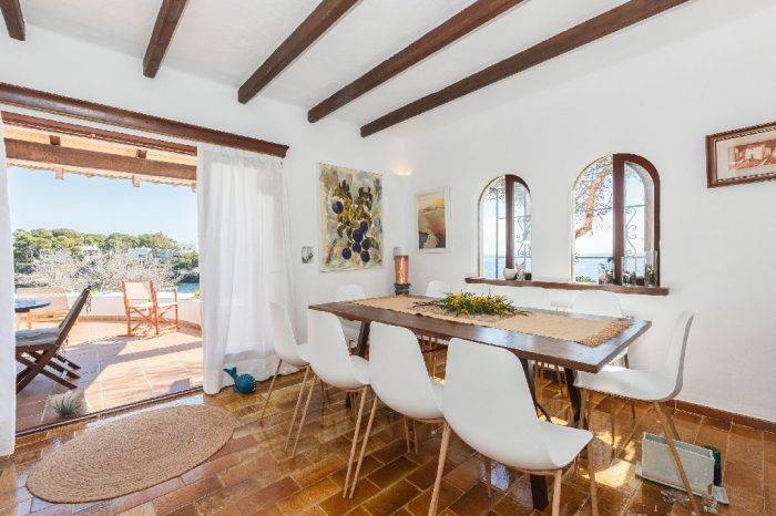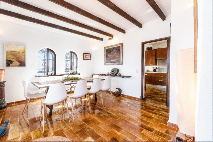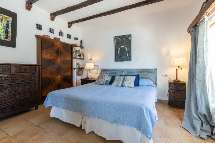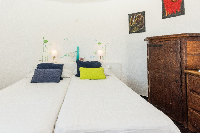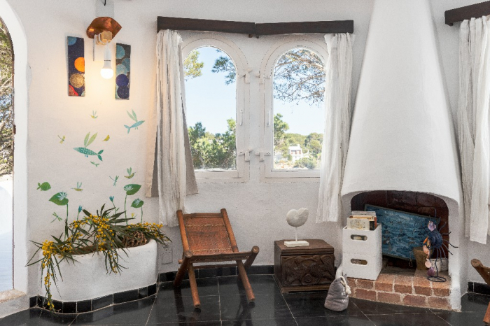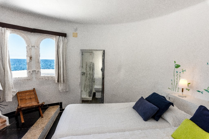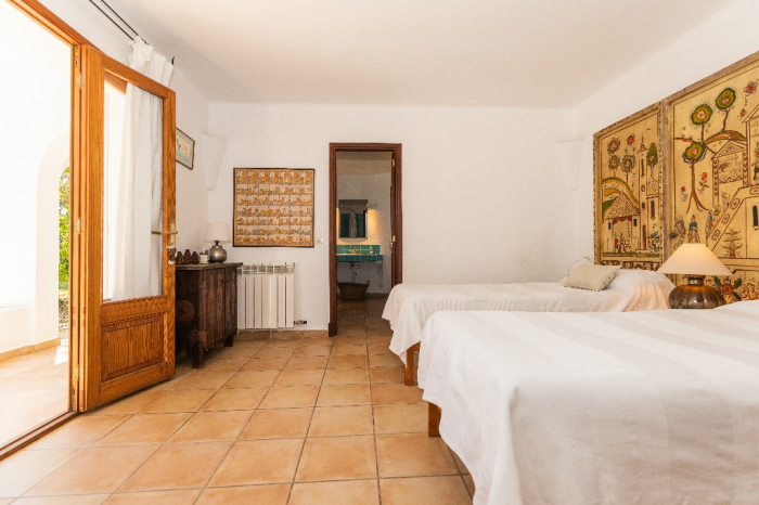 The living area of Villa Lorenzo is full of natural light and all the house with traditional white ibiza style design and hand-made furniture. The friendly rooms have white walls, terracota-tiled floors and beamed ceilings. Steps lead down from the front door to a lounge and dining room with two seating areas. From large windows and doors which lead to the terrace you enjoy fantastic sea views. The well planed fitted kitchen with all modern appliances doors lead out from here to the terrace, with a covered dining area. On the ground floor there is one bedroom with a double bed and another with two single beds. Both rooms have a complete bathroom en-suite. The first floor accomodates one more double room with two single beds and a shower bathroom. The remaining bedroom is in a separate tower annexe and you reach it with staircase on the outside. It is a lovely double room with two single beds, a shower-bathroom and a long private sun-terrace with superb views of the entrance to the cove. A very light and airy house thanks to its orientation and distribution. Every room in the house have windows and / or connection to the garden.