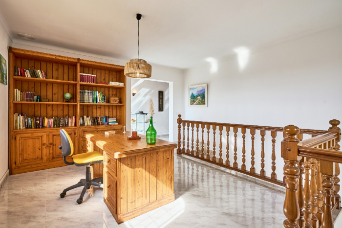 As we go to the upper floor, we find an office next to the landing. On this floor there are two bedrooms with double bed -one with access to its own terrace-, and a bathroom. From the hallway there is access to a terrace where you can sit and enjoy the open views of the area.