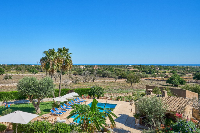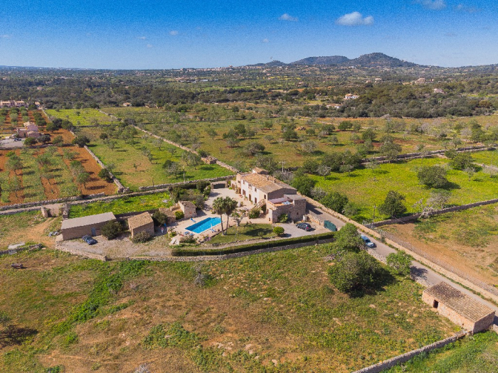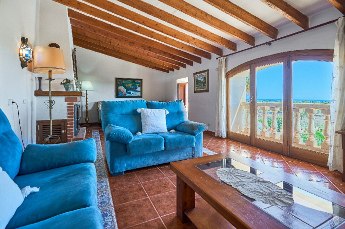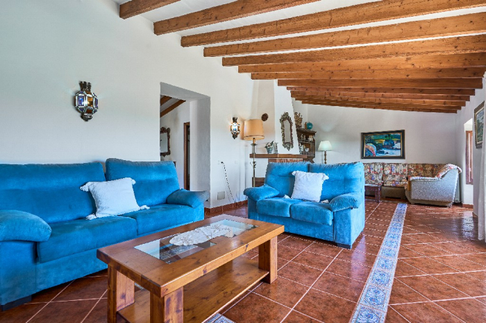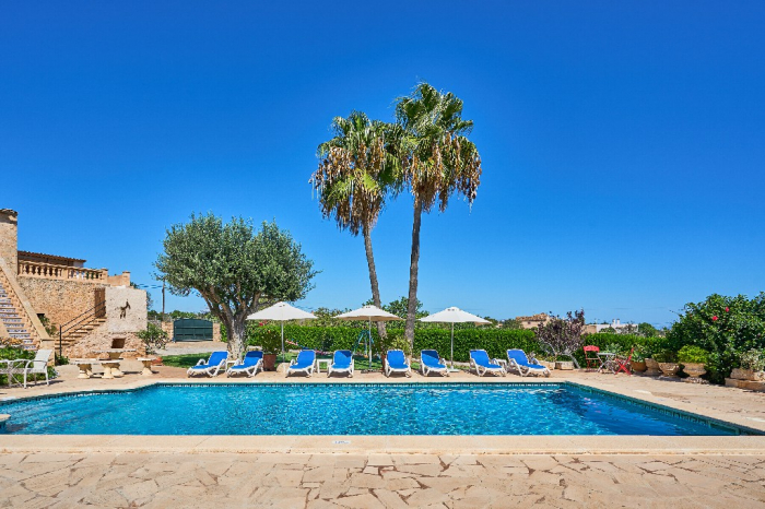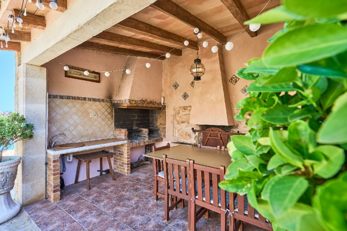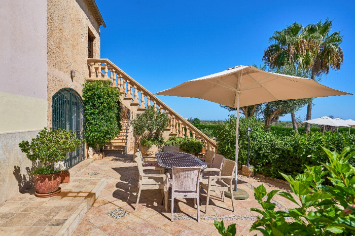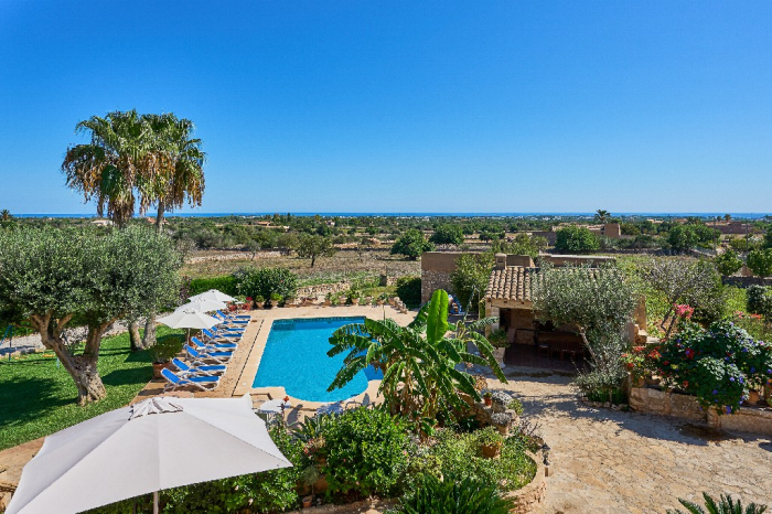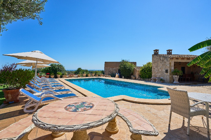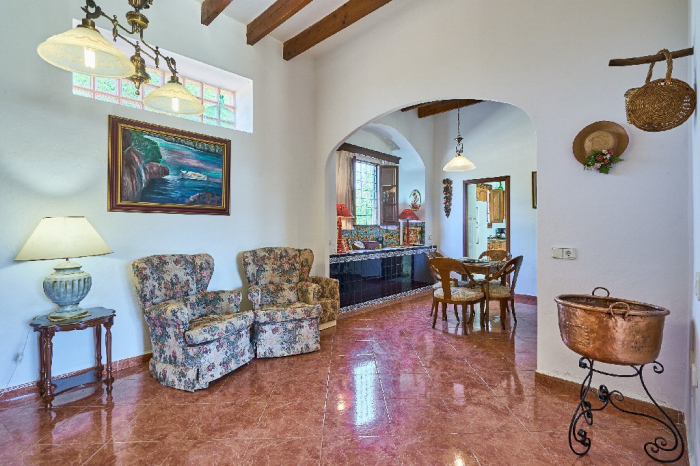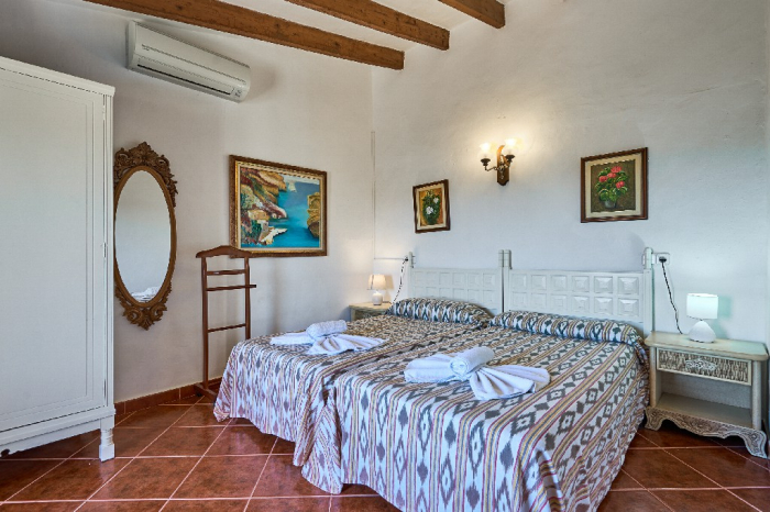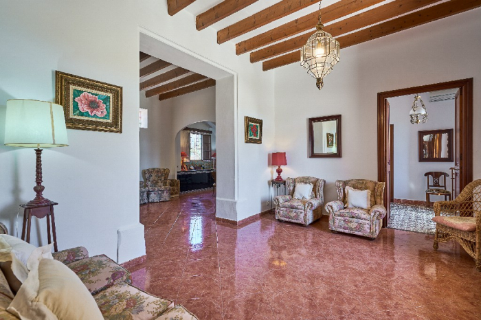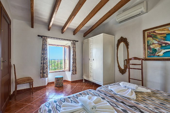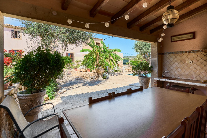 It is simple furnished with a mix of wooden furniture and antique dark-wood Majorcan furniture. The  exterior is very spacious private and relaxing with a lovely lawned area with Mediterranean plants, tall palm trees that provide a nice shade and a garden with almond and orange trees. From the pool area you will enjoy gorgeous open views of the countryside and down to the sea.