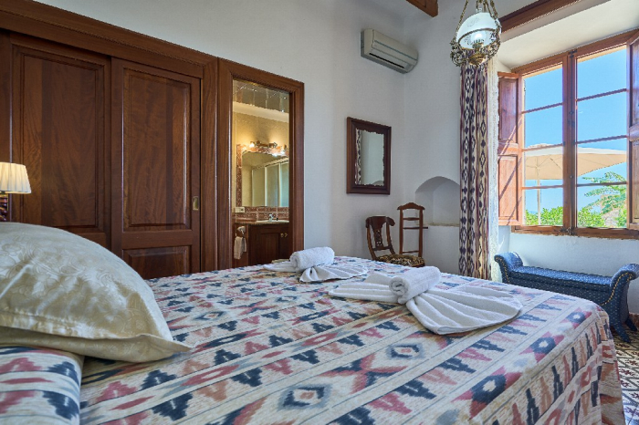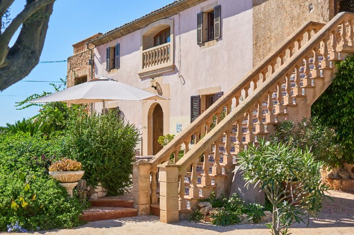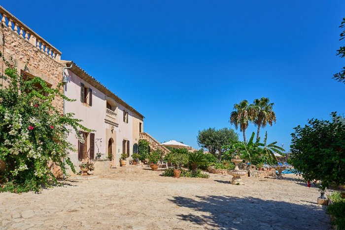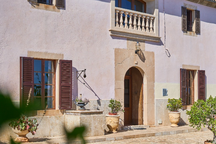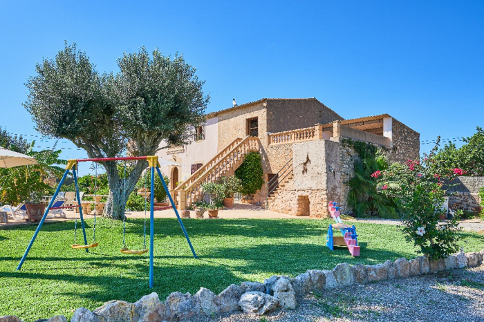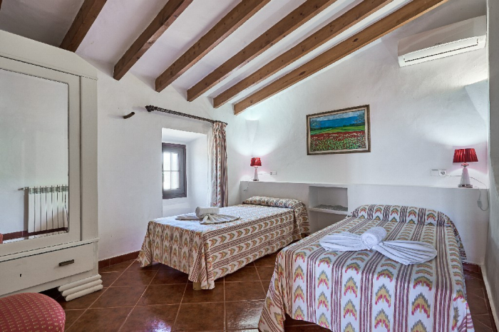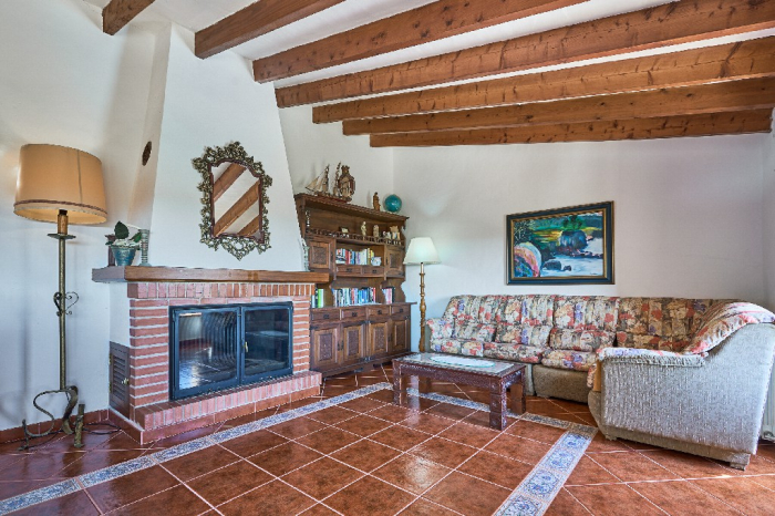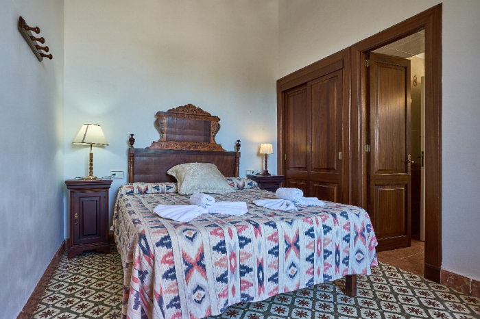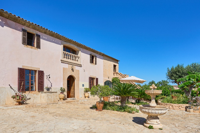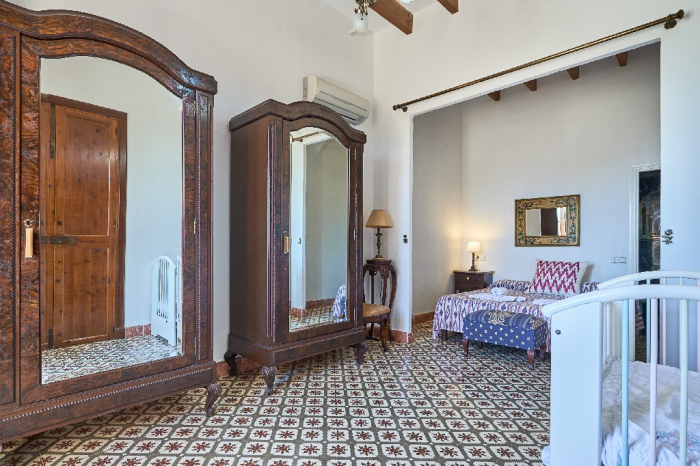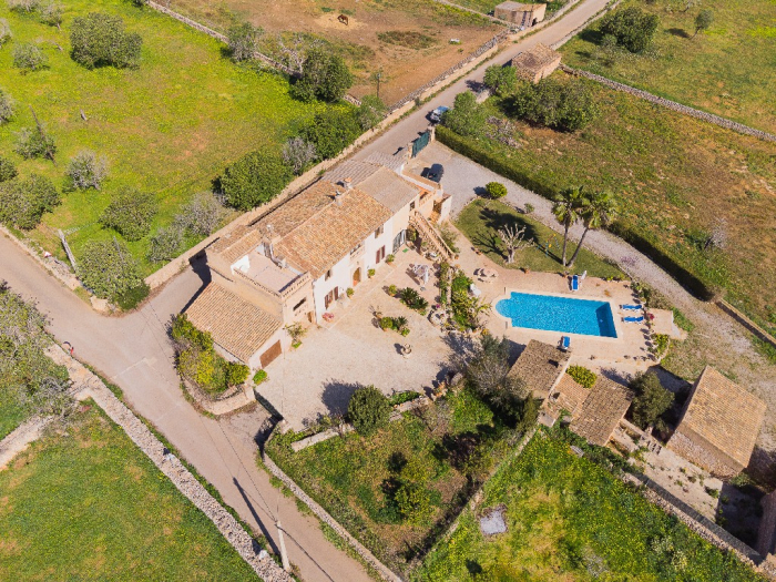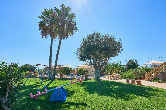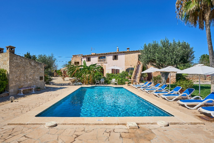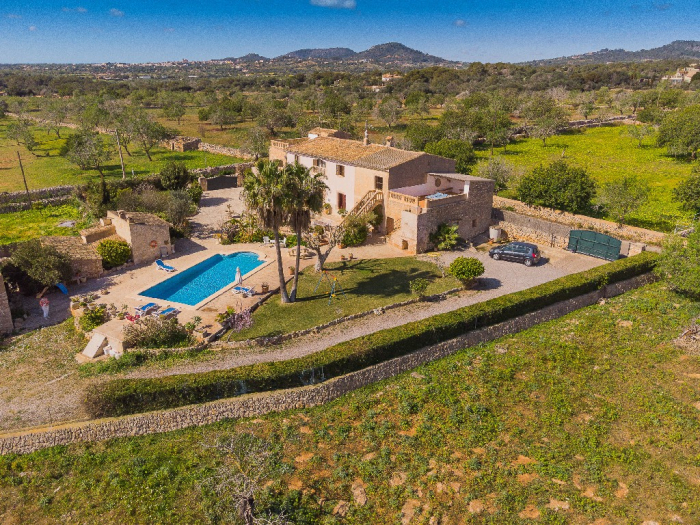 It is simple furnished with a mix of wooden furniture and antique dark-wood Majorcan furniture. The  exterior is very spacious private and relaxing with a lovely lawned area with Mediterranean plants, tall palm trees that provide a nice shade and a garden with almond and orange trees. From the pool area you will enjoy gorgeous open views of the countryside and down to the sea.