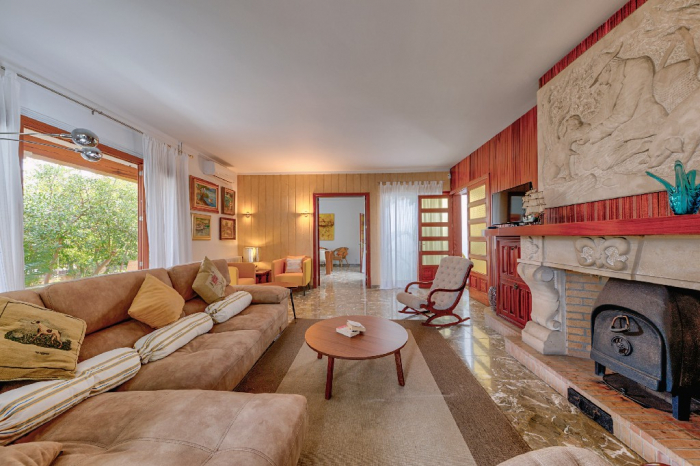 The villa offers a spacious and bright living room with air conditioning, large windows opening onto the outdoor terrace, and a dining room with a long table, ideal for family meals. From the dining room, you can access a fully equipped kitchen, perfect for preparing delicious local dishes. The villa has 3 double bedrooms and 1 bedroom with two single beds. It also has 2 bathrooms with showers and an additional bathroom.